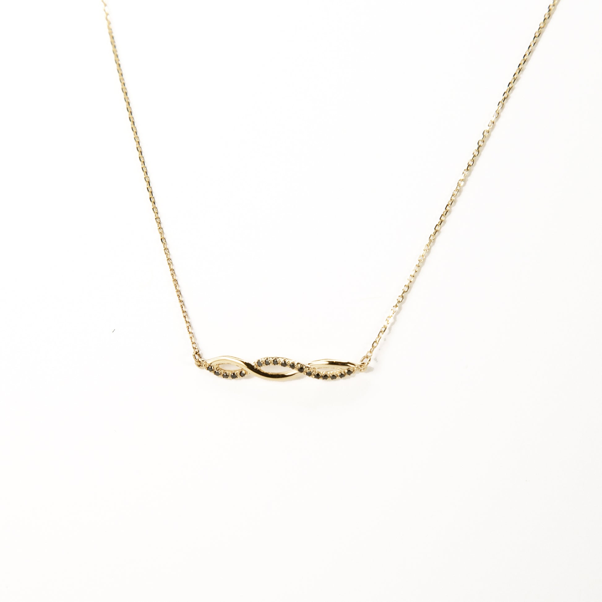 This Infinity Necklace effortlessly adds style and sophistication to your look. Crafted with gold and 17 small black diamonds surrounding the infinity element, it's the perfect combo of subtle sparkle and chic elegance.