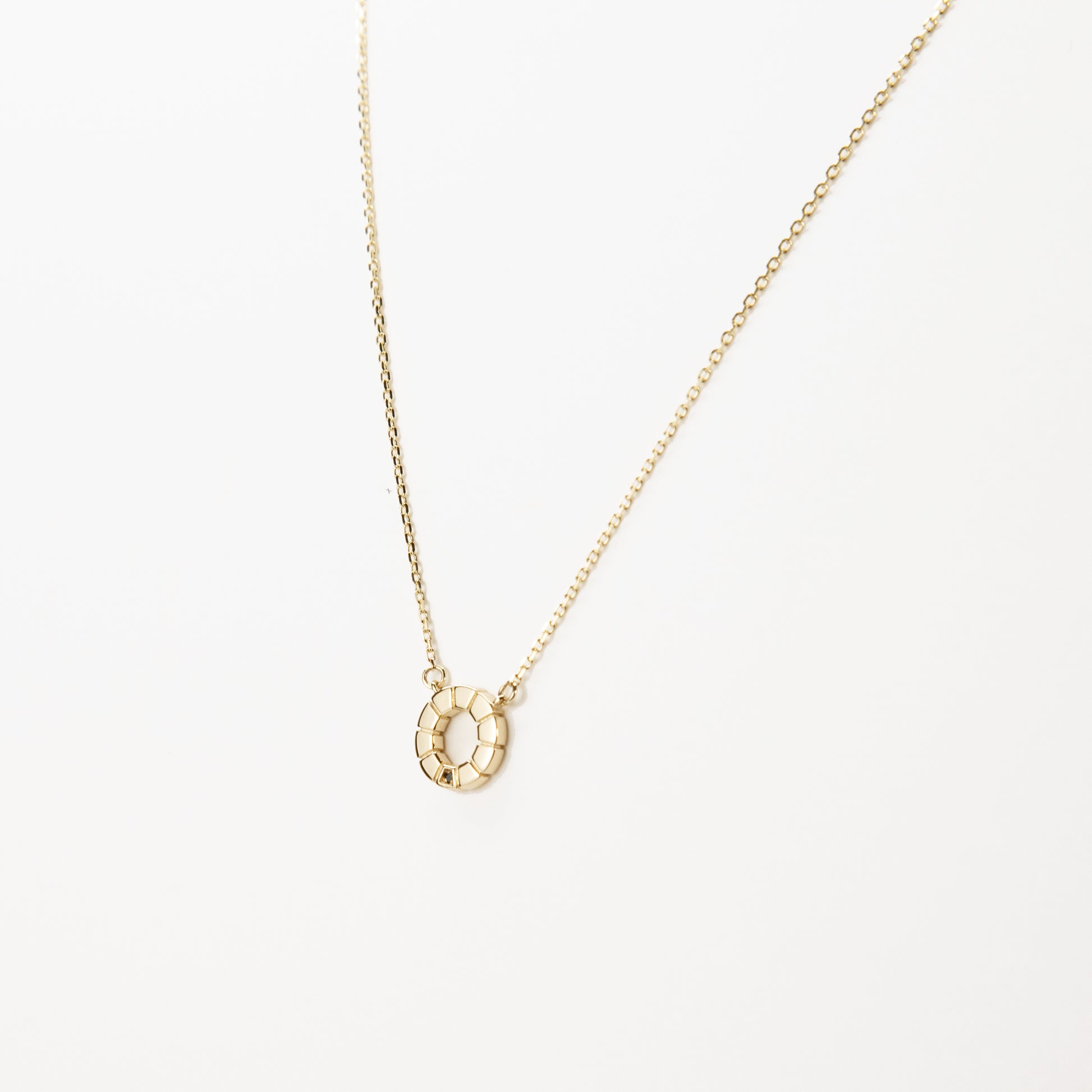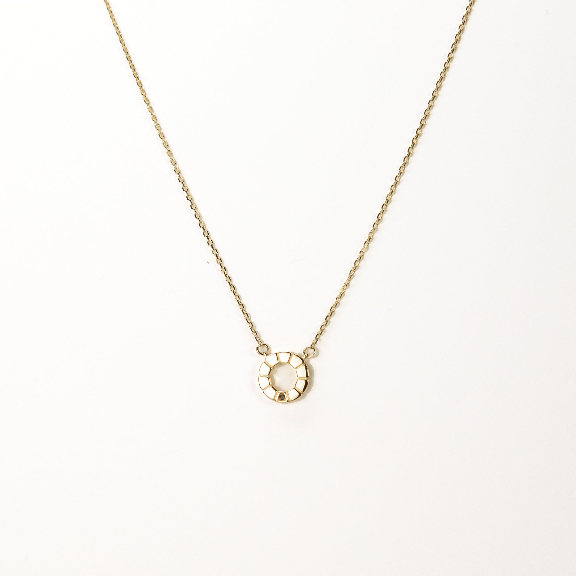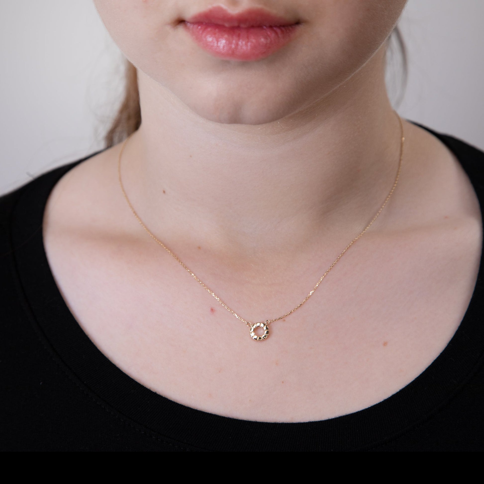 This modern necklace features a solid gold mini circular pendant with square design details. A timeless and elegant piece, perfect for everyday wear and special occasions.