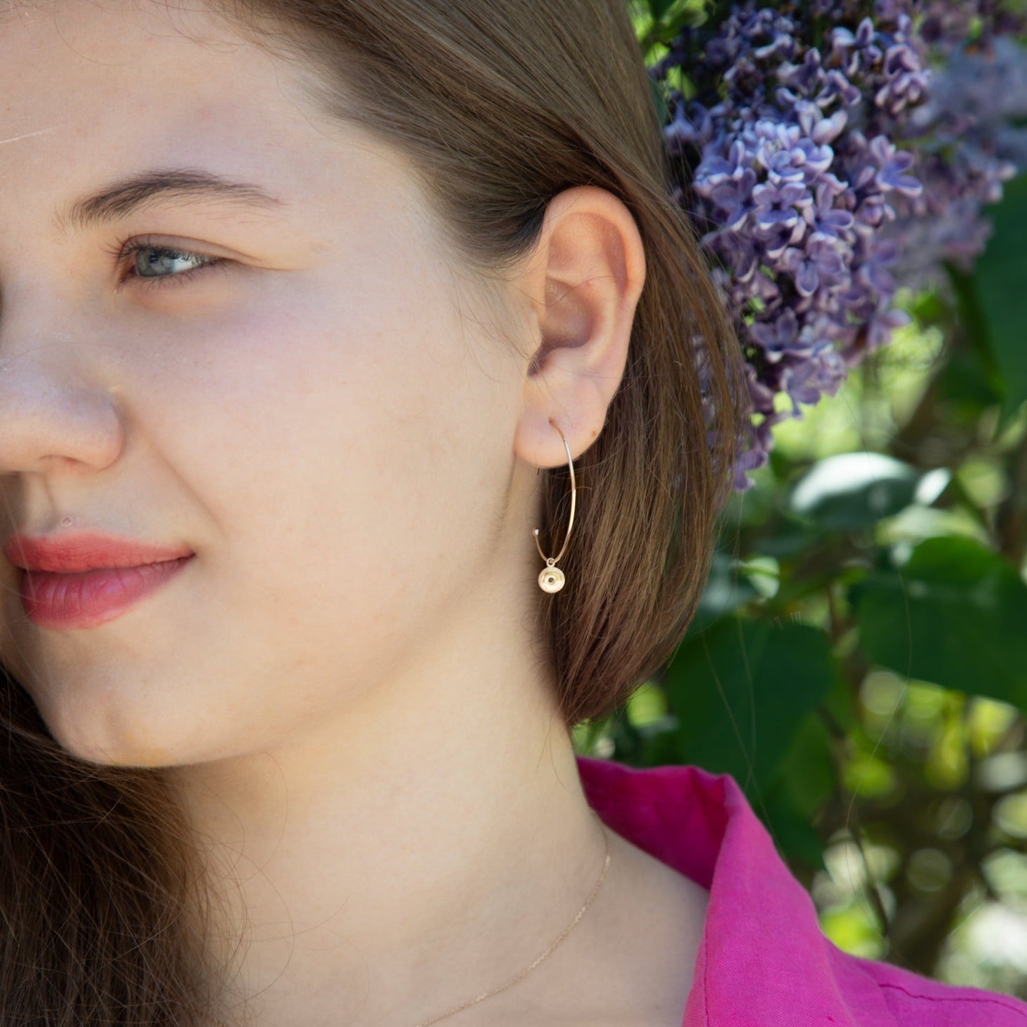These beautiful hoop solid gold Round Star Earrings feature a classic gold round pendant with a single black diamond encrusted in the center. Their timeless design makes them a perfect addition to any jewelry collection.